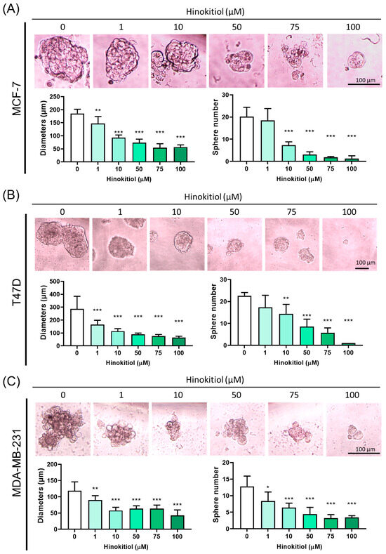 Hinokitiol suppressed sphere formation. (A) MCF-7, (B) T47D, and (C) MDA-MB-231 cells were cultured in a 6 cm dish and treated with hinokitiol for 48 h. After treatment, cells were detached and seeded at a density of 2000 cells per well in ultra-low attachment plates. A sphere formation assay was employed to evaluate both diameters and numbers of spheres formed. Data are presented as mean ± SD (n = 5–6). * p < 0.05; ** p < 0.01; *** p < 0.001 as compared with control group.