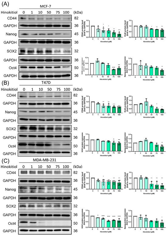 Effect of hinokitiol on stemness-related protein expression. (A) MCF-7, (B) T47D, and (C) MDA-MB-231 cells were cultured in a 6 cm dish and treated with hinokitiol for 48 h. Western blot was used to determine CD44, Nanog, SOX2, and Oct4 protein expression. Data are presented as mean ± SD (n = 3–4). * p < 0.05; ** p < 0.01; *** p < 0.001 as compared with control group.