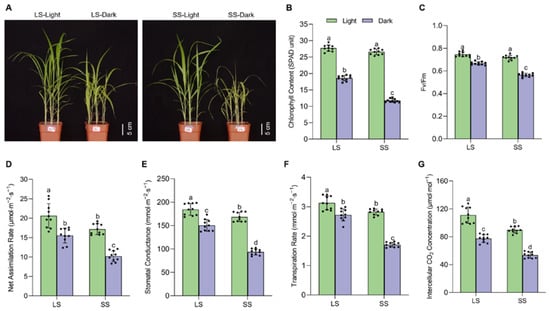 Differences in phenotype and photosynthetic parameters in two foxtail millet varieties during dark-induced senescence. (A) Representative images; (B) chlorophyll content (in SPAD unit); (C) Fv/Fm value; (D) net assimilation rate; (E) stomatal conductance; (F) transpiration rate; (G) intercellular CO2 concentration in 4-week-old seedlings leaves of LS and SS varieties under light or dark conditions for 7 d. Data are mean ± SD (n = 10 independent biological samples); different letters above the bars indicate statistically significant differences at p < 0.05 by one-way ANOVA, followed by Tukey’s post hoc tests for multiple comparisons.