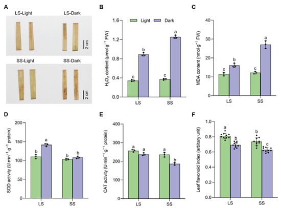 Differences in ROS accumulation and its enzymatic scavenging system in two foxtail millet varieties during dark-induced senescence. (A) DAB histochemical staining of leaves; (B) H2O2 content; (C) MDA content; (D) SOD activity; (E) CAT activity; (F) leaf flavonoid index in 4-week-old seedlings of LS and SS varieties under light or dark conditions for 7 d. Data are mean ± SD (n = 3 independent biological samples in A-E, n = 10 in F); different letters above the bars indicate statistically significant differences at p < 0.05 by one-way ANOVA, followed by Tukey’s post hoc tests for multiple comparisons.