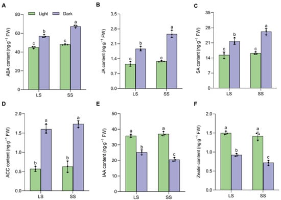 Subsequently, we examined the levels of senescence-related phytohormones in both LS and SS seedlings. As shown in Figure 3, no significant differences were observed in the contents of all detected phytohormones between LS and SS seedlings under normal light conditions. Upon dark treatment, senescence-promoting phytohormones, including ABA, JA, SA, and ACC (ethylene), exhibited significant increases in both varieties, whereas senescence-delaying hormones like IAA (auxin) and zeatin (cytokinin) declined sharply. Nevertheless, the acceleration of senescence-promoting phytohormones levels was more pronounced in SS than in LS, excluding ACC (Figure 3A–D). Conversely, the contents of IAA and zeatin decreased more significantly in SS than in LS following dark treatment (Figure 3E,F).