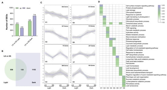To investigate the transcriptional regulation of the foxtail millet seedlings in response to DIS, we conducted RNA sequencing to determine the transcriptome changes in LS and SS seedlings subjected to either light or dark conditions for 7 days. As shown in Figure 4A, we identified 694 differentially expressed genes (DEGs) in the light-grown seedlings of LS relative to those in SS, including 416 up-regulated and 278 down-regulated genes. However, there were 1238 transcripts significantly affected in LS seedlings grown in the dark treatment relative to the SS, including 525 up-regulated and 718 down-regulated genes. Notably, cross-comparisons identified only 135 common DEGs (LS vs. SS) both in the control and in darkness (Figure 4B), which possibly resulted from the traits of similar developmental processes. To explore the gene co-expression patterns of the DEGs in the comparison between LS and SS under light or dark conditions, 1797 DEGs were classified into eight clusters (Figure 4C). It was found that genes in C1 (304) and C2 (167) were down-regulated during DIS and showed higher expression levels in LS compared with SS (Supplementary Tables S1 and S2). Compared with SS, the genes in clusters C3 (75) and C4 (369) were also highly expressed in LS, but there was no significant change between light and dark conditions (Supplementary Tables S3 and S4). Conversely, genes in C5 (312) and C6 (119) were significantly up-regulated during DIS, with higher expression levels in SS than in LS (Supplementary Tables S5 and S6). Genes in C7 (257) were highly expressed in SS under both conditions, which is contrary to C3 (Supplementary Table S7). Moreover, the expression levels of genes in C8 (194) were also higher in SS under light conditions, but under dark conditions, these genes were slightly down-regulated in LS and sharply down-regulated in SS (Supplementary Table S8). The cell surface receptor signaling and energy metabolism (light harvesting in photosystem I, glycolytic and starch catabolic processes, lipid storage and pyruvate metabolic processes) were obviously affected in the C1–C4 clusters, within genes up-regulated in LS. Chlorophyll biosynthesis and the activities of oxidoreductase and hydrolase, as well as those related to the response to cytokinin, were also enriched in these clusters. Genes in the C5–C8 clusters were mainly up-regulated in SS, most of which were related to carbohydrate metabolic process, cell redox and lipid homeostasis, phytohormone-associated processes (JA-mediated signaling and negative regulation of auxin-mediated signaling pathways), cell wall organization, and leaf senescence (Figure 4D). Presumably, co-expression changes in these genes between LS and SS could reflect strong transcriptional effects and the involved functional processes of regulating leaf senescence in foxtail millet.