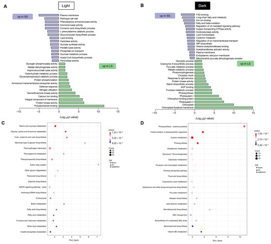 Specific GO term enrichment analysis for DEGs in the LS vs. SS group under (A) light and (B) dark conditions. p-value is the significance of the enriched GO terms. KEGG pathway enrichment for DEGs in the LS vs. SS group under (C) light and (D) dark conditions. Rich factor refers to the significant enrichment level of DEGs in this pathway.