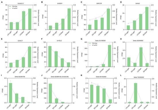 Physiological and biochemical changes during leaf senescence are influenced by the expression of SAGs. Here, we selected several SAGs according to previous studies and the functional annotation from the transcriptome data. As shown in Figure 6A, the hallmark senescence-progression-related gene SiSAG12 was up-regulated by DIS in the two varieties, but the expression level was significantly higher in SS. The expression levels of genes associated with chlorophyll degradation, including SiSGR1, SiRCCR, and SiPAO, were consistently up-regulated after dark treatment. In addition, the expression of these genes was increased in SS both under light and dark conditions (Figure 6B–D). We also detected the expression of two other senescence-related genes, SiNAC1 and SiYGL2, which serve as a positive regulator and a negative regulator, respectively, in the process of leaf senescence in foxtail millet [,]. In contrast, the expression of SiNAC was significantly up-regulated in SS compared to in LS, and the expression level of SiYGL2 was dramatically decreased, especially after dark treatment (Figure 6E,F). Next, we identified six SiSAGs from DEGs according to the functional annotation. It was found that the senescence regulator Seita.3G168300 was induced by DIS, and the expression level was significantly higher in SS (Figure 6G). The flavonoid-biosynthesis-related gene Seita.4G054600 showed a higher expression level in LS and was up-regulated after dark treatment but did not significantly change in SS (Figure 6H). The receptor protein kinase coding gene Seita.5G264700 and the senescence-specific cysteine proteas coding gene Seita.9G089100 (SiSAG39) were down-regulated by DIS in the two varieties, and their expression levels were approximately ten and twenty times lower in SS than in LS (Figure 6I,J). The receptor-like protein kinase (RLK) coding gene Seita.9G192500 was significantly up-regulated in LS compared to SS after dark treatment, but the difference was not significant under light conditions (Figure 6K). The expression level of DNA catabolic-related gene Seita.7G255200 was higher in SS than in LS under light conditions, but there was no difference between the two varieties after dark treatment (Figure 6L). RT-qPCR analysis was performed to validate the expression profiles of these SAGs in foxtail millet, and the expected expression pattern further confirmed the reliability of the transcriptome data.