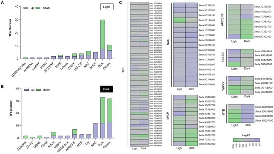 Analysis of TFs and PKs predicted from DEGs in the LS vs. SS comparisons under light or dark conditions. The number of (A) up- or (B) down-regulated differentially expressed TF or PK families; (C) a heat map showing the expression changes in genes encoding the main TFs or PKs. Each cell shows the log2 ratio of fold change in LS relative to that of SS under light or dark conditions.