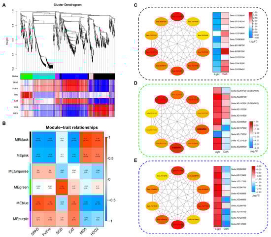 WGCNA analysis of DEGs involved in DIS of foxtail millet. (A) Hierarchical cluster tree of co-expression modules identified by WGCNA. The six major modules were labeled with different colors; (B) correlation analysis between gene modules and senescence-related traits; (C–E) top ten candidate hub genes selected from MEblack, MEgreen, and MEblue modules. Heatmaps showing the expression profiles of the hub genes from the representative modules.
