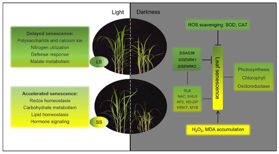 Transcriptomic analyses have identified a large number of the underlying SAGs and TFs in crops, including maize, sorghum, wheat, and rice, which provide valuable insights into the regulation of leaf senescence [,,,]. Dark treatment is a stable and controlled carbon-starvation-induced senescence system, extensively employed for the characterization and analysis of various senescence phenotypes [,]. Here, we systematically analyzed the leaf senescence progression of 360 accessions from the core collection of foxtail millet [] by DIS at the seedling stage and screened extreme varieties exhibiting either LS or SS phenotypes. The phenotypic, physiological, and antioxidant enzyme activity characteristics of the two varieties were investigated. Additionally, we conducted a comparative transcriptome analysis between the two varieties under light or dark conditions to identify differentially expressed genes and biological processes associated with leaf senescence in foxtail millet. Furthermore, we screened for the key candidate genes that potentially regulate leaf senescence in foxtail millet. This study lays the foundation for an in-depth analysis of the leaf senescence regulation network and provides important gene resources for the molecular breeding for foxtail millet varieties with high and stable yield.