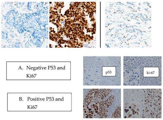 Microscopic aspects regarding the pattern of p53 and Ki-67. Mutant pattern 0% and over 60% Wildtype pattern 1–59% (Magnificationx200).