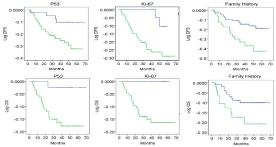Evaluation of DFS and OS in correlation cu P53, Ki-67, family history. The blue line represents negativ cases with P53 (-)/Ki-67<14%/Family history (-) and the green line represents positive cases with P53 (+)/Ki-67>14%/Family history (+).