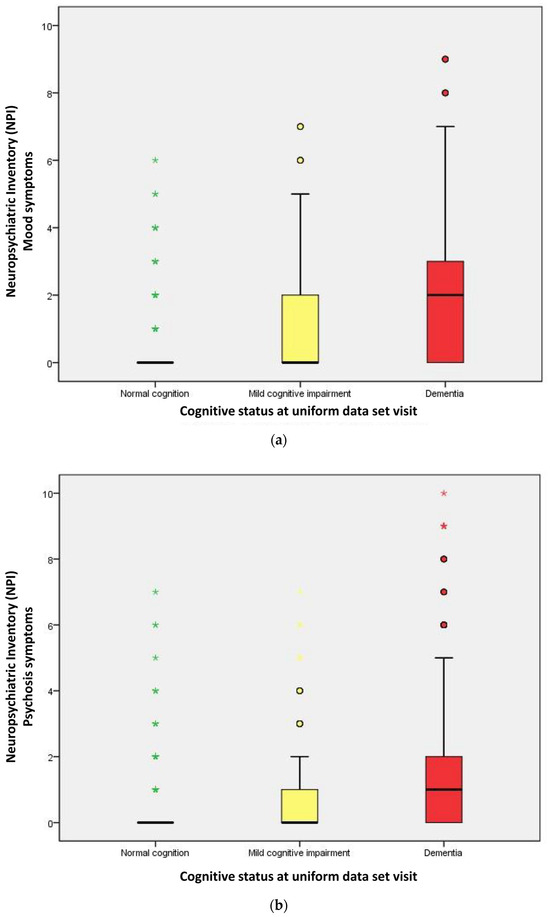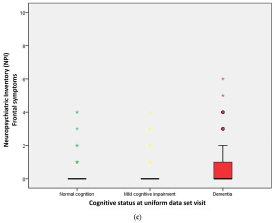Distribution of NPI-group score stratified by cognitive status. (a) Mood symptoms, (b) Psychosis symptoms, (c) Frontal symptoms. o (circle): Mild outliers, data points that are more extreme than than Q3 + 1.5 * IQR, but are not extreme outliers. * (asterisk): Extreme outliers, data points that are more extreme than Q3 + 3 * IQR.