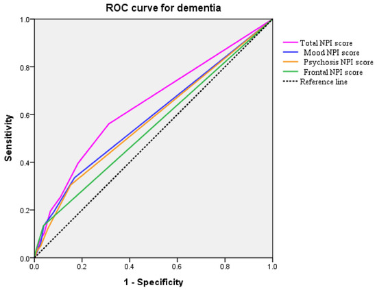 The ROC curves generated for the total NPI and three NPI-group scores were presented in Figure 4. Areas under the curve for the total NPI, mood, psychosis, and frontal symptom score were 0.638 (95% confidence interval 0.589–0.687, p < 0.001), 0.587 (0.536–0.638, p < 0.001), 0.577 (0.526–0.627, p = 0.002), and 0.548 (0.498–0.599, p = 0.005), respectively, indicate a moderate accuracy to predict dementia.