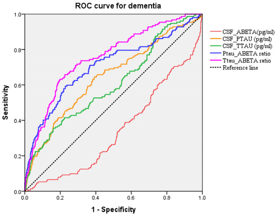 The ROC curve analysis of the CSF biomarkers accuracy for Dementia prediction.