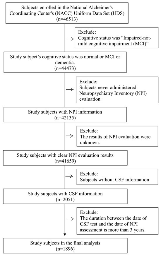 Participants enrolled in the NACC program and with cognitive status ranging from normal cognition to MC), or dementia (which was determined based on an experienced clinician’s diagnosis and/or neuropsychological examination) were included in the present study [42]. Subjects were excluded if they never administered a Neuropsychiatry Inventory (NPI) evaluation, or if the results of the NPI evaluation were unknown or without CSF information. The duration between the date of the CSF test and the date of the NPI assessment is more than 3 years was also excluded.