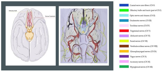 - Sonne, J.; Reddy, V.; Lopez-Ojeda, W. Neuroanatomy, Cranial Nerve 0 (Terminal Nerve), StatPearls. 2023. Available online: https://www.ncbi.nlm.nih.gov/books/NBK459159/ (accessed on 26 February 2024).