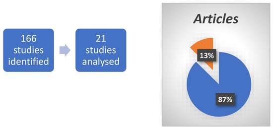 Left: From 166 studies 145 were excluded as non-relevant for our study; these include those in non-English languages and those with full text not available. Right: blue represents excluded articles; orange represents included and analyzed articles, as a percentage.