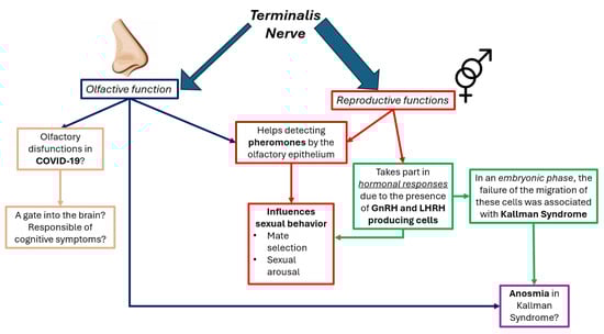 The figure illustrates the new proposed functions and pathological correlations of the terminalis nerve (TN). The first arrows have a different shape, demonstrating that most of the studies propose a more impactful role of TN in the reproductive function than in the olfactive one. Nevertheless, one does not exclude the other. Also, in this scheme associations between these two functions are present. Different colors were used: the left boxes (salmon color) show the hypothesis that COVID-19 is associated with the TN, while the red boxes show the role of this nerve in reproduction. The green boxes explain a possible etiology of Kallmann syndrome, in which a characteristic symptom is anosmia (violet box).