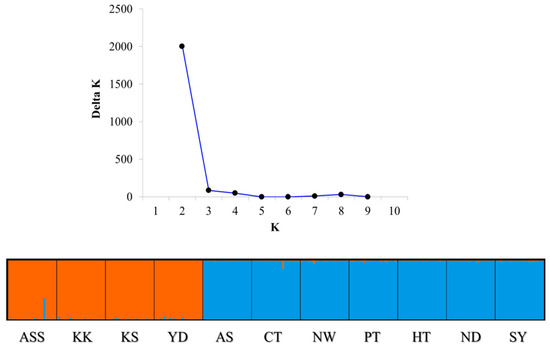Bayesian clustering analysis maximized the delta population constant (ΔK) value for population structure at K = 2 (Figure 1). At K = 2, the first group included the ASS, KK, KS, and YD populations. The second included the AS, CT, NW, PT, HT, ND, and SY populations. Although it did not inhabit the Nakdong River, the artificially produced ND population appeared to belong to the AS, CT, NW, PT, HT, ND, and SY populations.