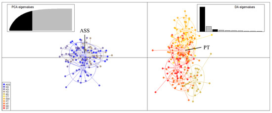 Scatterplots of the discriminant analysis of principal components (DAPC) showed that the first populations were the ASS, KK, KS, and YD populations and the second populations were the AS, CT, NW, PT, HT, ND, and SY populations, which was the same result as that of STRUCTURE (Figure 2).