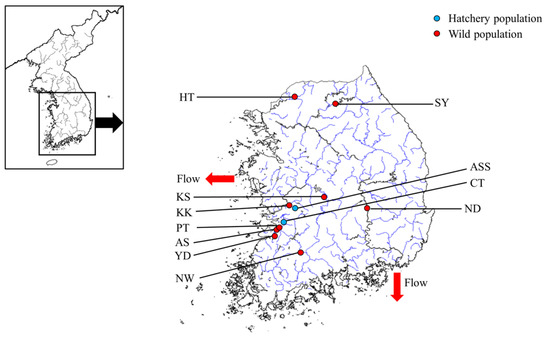 In South Korea, fishery for T. fulvidraco is very popular today (https://www.fira.or.kr/fira/main.jsp: accessed on 1 May 2022). Commercial fishing of T. fulvidraco has continued in wild populations such as the Hantan River, Seomjin River, and Geum River in the Korean Peninsula, but its catches are decreasing due to ecosystem changes. Therefore, to prevent this decline and sustain the catches, the local government has continued to release T. fulvidraco by purchasing hatchery populations from private hatcheries after captive breeding of broodstock collected from the wild. In this process, its genetic diversity is an important consideration when collecting broodstocks from wild populations [5]. Release of hatchery-reared individuals can increase fishery productivity, accelerate the recovery of depleted stocks, and ensure stock survival [5]. High genetic diversity affects the hatchability and survival rates of offspring [6]. In this process, if genetic management is not carried out, genetic variation in hatchery fry may be reduced, which may have a negative impact on wild populations after release [7]. Therefore, hatcheries must take genetic diversity into account and collect a variety of broodstock to maintain high genetic diversity [6,7].