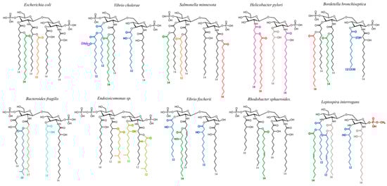 - Saha, S.; Pupo, E.; Zariri, A.; Van Der Ley, P. Lipid A Heterogeneity and Its Role in the Host Interactions with Pathogenic and Commensal Bacteria. MicroLife 2022, 3, uqac011. [Google Scholar] [CrossRef]