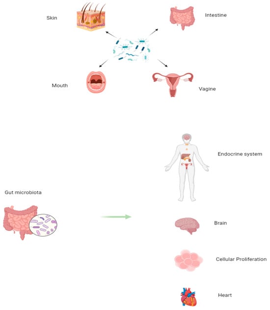In addition to these functions, GM also modulates the functions of the central nervous system, in which the metabolites released by the microbiota influence mood, stress regulation, and instinctive behaviors on the cardiovascular and endocrine–metabolic systems; the cardiovascular system is also modulated by GM through disease risk factors that cause hyperlipidemia, atherosclerosis, and type 2 diabetes and the digestive system through the action of microbiota products absorbed from the intestine and transferred to the liver (see Figure 1) []. Thus, GM also impacts the individual’s physical and mental health. However, even if generally considered beneficial, some GM microbes can cause a potential danger to the human organism []. When the homeostasis of the microbiota is disturbed, most of it becomes pathogenic, in which remodeling occurs that alters the sophisticated balance of the microecosystem in the gastrointestinal tract, contributing to a variety of pathological conditions and negatively affecting the physiological processes of the host []. This imbalance, called “microbial dysbiosis”, shows a reduction in microbes favorable to the health of the host and an excessive presence of pathogenic microbes with deleterious functions []. For example, Bacteroides fragilis and Fusobacterium nucleatum are known to induce a proinflammatory state in the colon, which could potentially increase oncogenic proliferation in the mucosal microenvironment [,].