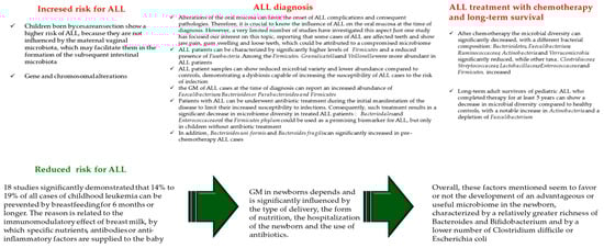 The ALL pathogenesis is evocated by both inherited and modulable factors, including genetic/chromosomic alterations and environmental factors. The latter category comprises alcohol, cigarettes, radiation exposure, chemical compounds, infections, and drugs. Modulable factors during pregnancy can affect the fetus by causing genetic mutations []. To date, however, the deep relationship between these factors and ALL onset, as well as the exact mechanisms and pathways involved in such complex ALL pathophysiology, are still not clear []. However, in the last few years, research has been focused on microbiomes since, in adult ALL cases, the microbiome has been demonstrated to be significantly associated with both onset and progression as well as modulation of the response and side effects of chemotherapy drugs, infection during treatment, and therapeutic efficacy [,,]. Such particular attention is increasing given the growing evidence on the capacity of parents’ microbiomes and particularly of the gut microbiome (GM) to impact the formation, growth, and functions of a newborn’s hematopoietic system (HS) through fetal developmental programming as well as the newborn’s susceptibility to developing onco-hematological neoplasms []. Here, we describe and discuss the literature evidence on the GM role in pediatric ALL, as well as suggest some therapeutic strategies aimed at recovering microbiomes.