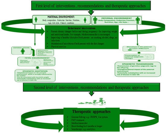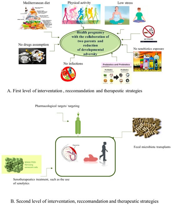 Two levels of interventions, recommendations, and therapeutical strategies in parents (A) and in children after the birth (B).