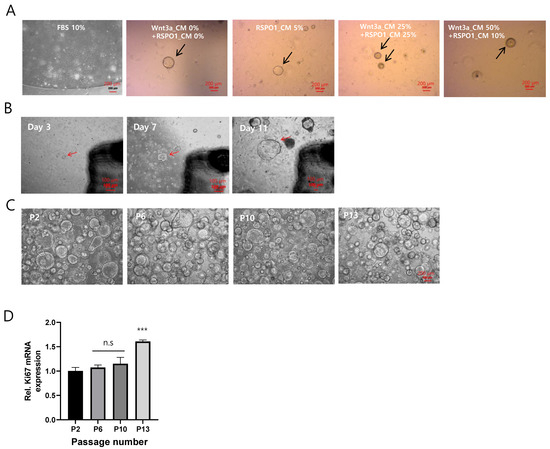 Development of three-dimensional organotypic models of adipose-derived stem cells (ADSCs). (A) ADSCs isolated from mouse adipose tissue were cultured in Matrigel with different combinations of Wnt3a- and R-Spondin1-conditioned media (CM): Wnt3a_CM 0% + RSPO1_CM 0%, RSPO1_CM 5%, Wnt3a_CM 25% + RSPO1_CM 25%, and Wnt3a_CM 50% + RSPO1_CM 10% and fetal bovine serum (FBS) 10% as a control. Scale bar size is 200 μm. (B) ADSCs exhibited organotypic growth and increased organoid size from days 3 to 11. Scale bar size is 100 μm. (C) Passaging of 3D organotypic cultures of ADSCs was achieved multiple times. Scale bar size is 200 μm. (D) The mRNA expression of Ki67, a marker for cell proliferation, was well preserved and even increased at passage 13. The values are the means ± standard deviations (n = 4). *** p < 0.001 compared with P2. Rel, relative; n.s., insignificant. The black and red arrow indicated the growth of cells in organotypic formation.