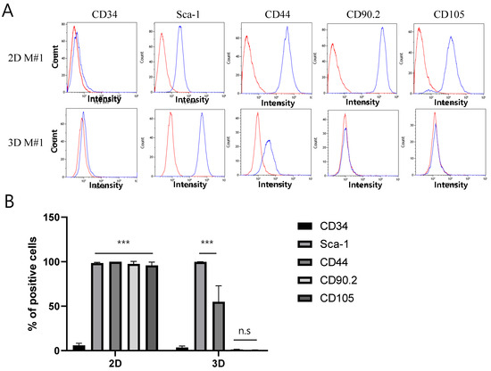Evaluation of the mesenchymal stem cell (MSC) phenotype in 2D- and 3D-cultured ADSCs. (A) Representative flow cytometry analysis (FACS) mouse #1 ADSC results. The top panel represents the results of ADSCs in the 2D culture condition, while the bottom panel displays the results of ADSCs in the 3D culture condition. The isotype is represented by the red line, while the target protein is depicted by the blue line. (B) Quantifying the percentage of positive cells for each antibody from the FACS results. The values are the means ± standard deviations (n = 4). *** p < 0.001 compared with either 2D or 3D CD34. Rel, relative; n.s., insignificant. M#1 refers to analyzed mouse #1.
