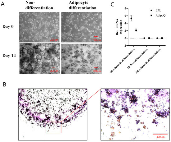 Adipocyte differentiation was performed to investigate the differentiation potential of 3D organotypic ADSCs. The cells were cultured in the indicated differentiation media for 14 days and cell images were visualized on the 14th day (Figure 3). The results showed that during the differentiation process of each respective cell lineage, the organoid size decreased compared to the nondifferentiation control group, indicating an overall unfavorable cellular state. In particular, on the 14th day of differentiation into adipocytes, when performing Oil Red O staining to confirm adipogenic differentiation (Figure 3B), we observed that staining did not occur effectively. Only peripheral cells of the matrix stained positive for Oil Red O, indicating adipogenic differentiation. Alternatively, we stained the cells with LipidTox, which fluorescently stains fat but cannot confirm differentiation into adipocytes (Supplementary Figure S2). To confirm differentiation at the molecular level, mRNA expression of the adipocyte markers lipoprotein lipase (LPL) and AdipoQ was determined using adipocytes differentiated from 2D ADSCs as positive controls. LPL and AdipoQ mRNA expression were not detected in 3D ADSCs (Figure 3C).