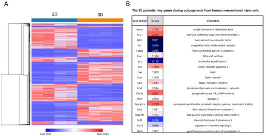 Comparative analysis of molecular signatures in 2D- and 3D-cultured ADSCs. (A) Hierarchical clustering analysis depicting distinctive gene expression patterns between 2D- and 3D-cultured ADSCs. (B) The list and relative mRNA expression levels of adipogenesis-associated key genes in 2D- and 3D-cultured ADSCs.