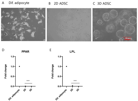 Total RNA sequencing was performed to study the molecular signatures of the 2D- and 3D-cultured ADSCs. Hierarchical clustering revealed distinct gene expression patterns between the two groups (Figure 4A). A total of 1797 and 1748 genes were identified as differentially expressed, upregulated (fold change > 2, p < 0.05), and downregulated (fold change < 0.5, p < 0.05), respectively, in the 3D samples. To explore the adipogenic capacity of MSCs after 3D culture, we compared gene expression levels in 2D and 3D samples with key candidate genes reported for adipogenesis, as previously described [20]. Fourteen of the twenty genes were differentially regulated between the 2D and 3D samples (Figure 4B), demonstrating alterations in the adipogenic differentiation of 3D ADSCs. The expression of adipocyte marker genes was examined to investigate whether the 3D culture of ADSCs activates the adipogenesis pathway. Images of 2D MSCs differentiating into adipocytes (Figure 5A), 2D ADSCs (Figure 5B), and 3D ADSCs (Figure 5C) are shown. The mRNA expression levels of peroxisome proliferator-activated receptors (PPARs) (Figure 5D) and LPL (Figure 5E) were measured in 2D and 3D ADSCs, with 2D MSCs differentiating into adipocytes and serving as positive controls. Neither PPAR nor LPL mRNA expression was detected in 2D or 3D ADSCs. In contrast, the significant expression of these genes was observed in the differentiated adipocytes. These results indicate that the 3D culture of ADSCs may not be associated with changes in the expression of adipogenesis-related genes. These results suggest that the stem cell properties of ADSCs may change during 3D culture.