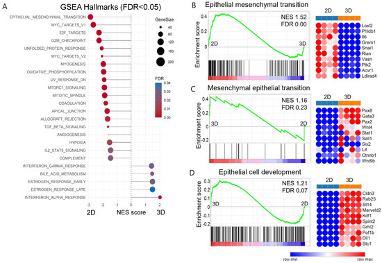 Total RNA sequencing-based functional enrichment analysis of ADSCs. (A) Gene set enrichment analysis (GSEA) for the hallmark gene sets using the entire gene between 2D- and 3D-cultured ADSCs. (B) Notable enrichment of ‘epithelial–mesenchymal transition (EMT)’ in the gene dataset of 2D ADSCs. (C) A positive correlation of 3D ADSCs with ‘mesenchymal–epithelial transition (MET)’. (D) A positive correlation of 3D ADSCs with epithelial cell development. NES, normalized enrichment score; FDR, false discovery rate.