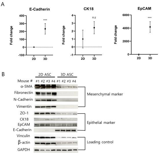Evaluation of the expression levels of mesenchymal and epithelial markers in 2D- and 3D-cultured ADSCs. (A) Analysis of mRNA expression levels of epithelial markers (E-cadherin, CK18, and EpCAM) using reverse transcription polymerase chain reaction. (B) Assessment of the protein expression levels of mesenchymal markers (α-SMA, fibronectin, vimentin, and N-cadherin) and epithelial markers (ZO-1 and EpCAM) in 2D- and 3D-cultured ADSCs. Notably, beta-actin and vinculin showed decreased expression in 3D culture, while GAPDH remained consistent. The values are the mean ± standard deviations (n = 4). *** p < 0.001 compared with 2D; n.s., insignificant.