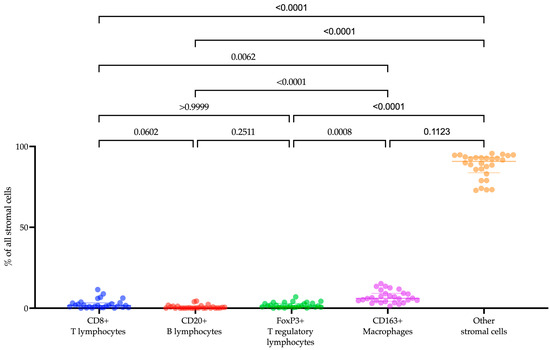 The composition of the tumor microenvironment in patients with recurrent or metastatic endometrial cancer was examined (Figure 1). Among the cell populations we analyzed, CD163+ macrophages (6.06 (4.24–9.14)%) were the most prevalent. Following in descending order were CD8+ T lymphocytes (1.59 (0.46–3.28)%), FoxP3+ T lymphocytes (1.19 (0.66–2.96)%), and CD20+ B lymphocytes (0.16 (0.06–1.10)%) (Friedman test with Dunn’s correction, p = 0.0001). While we did not specifically identify other cells in the tumor microenvironment, their morphology enabled us to differentiate fibroblasts, macrophages, and lymphocytes among them.