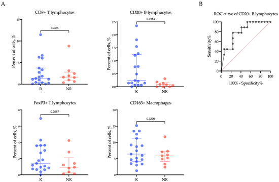 The proportion of CD8+ T lymphocytes, CD20+ B lymphocytes, FoxP3+ T lymphocytes, and CD163+ macrophages (A) within the tumor microenvironment in endometrial cancer patients according to response to treatment with Pembrolizumab plus Lenvatinib, and (B) ROC analyses of the predictive value of CD20+ B lymphocytes. Rs: responders; NRs: non-responders.