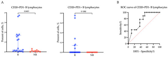 The proportion of CD20+PD1− B lymphocytes and CD20+PD1+ B lymphocytes (A) within the tumor microenvironment in endometrial cancer patients according to response to treatment with Pembrolizumab plus Lenvatinib, and (B) ROC analyses of the predictive value of CD20+PD1− B lymphocytes. Rs: responders; NRs: non-responders.