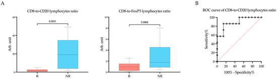 The CD8-to-CD20 lymphocytes ratio and CD8-to-FoxP3 lymphocytes ratio (A) within the tumor microenvironment in endometrial cancer patients according to response to treatment with Pembrolizumab plus Lenvatinib, and (B) ROC analyses of the predictive value of the CD8-to-CD20 lymphocytes ratio. Rs: responders; NRs: non-responders.
