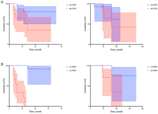 Survival analyses of progression-free survival (PFS) and overall survival (OS) regarding the proportion of CD20+ B lymphocytes (A) and the CD8-to-CD20 lymphocytes ratio (B) within the tumor microenvironment in endometrial cancer patients. Overall survival is defined as the interval between the start of immunotherapy and death from any cause. Progression-free survival is defined as the time from the start of immunotherapy to the first documented tumor progression or death from any cause.