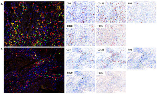 Tumor infiltration of CD8+ cytotoxic lymphocytes, CD20+ B lymphocytes, FoxP3+ T-regulatory (Treg) lymphocytes, and CD163+ macrophages in the cohort of responders (A) and non-responders (B). In the multiplex immunofluorescence images CD8+ cytotoxic lymphocytes have a green pseudo-color, CD20+ B lymphocytes are yellow, CD163+ macrophages are red, Treg lymphocytes are orange, PD1 expression is white, and DAPI (nuclear counterstain) is blue. Separate markers with nuclear are presented as IHC simulations, which can be performed by Inform software based on obtained multiplex staining data. TSA-associated multiplex immunofluorescence, 200×.