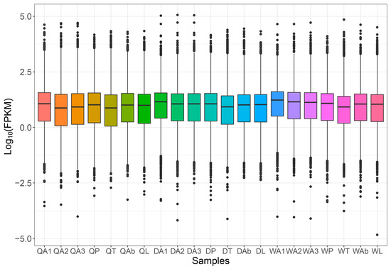 Figure 1. A box plot showing FPKM values in 21 tissues of different castes of A. cerana. QA: Queen antenna; QP: Queen proboscis; QT: Queen thorax; QAb: Queen abdomen; QL: Queen legs; DA: Drone antenna; DP: Drone proboscis; DT: Drone thorax; DAb: Drone abdomen; DL: Drone legs; WA: Worker antenna; WP: Worker proboscis; WT: Worker thorax; WAb: Worker abdomen; WL: Worker legs.