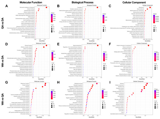 Figure 2. The unigenes GO enrichment analysis of upregulated genes in the antenna of different castes of A. cerana. (AC) QA vs. DA group; (DF) WA vs. DA group; (GI) WA vs. QA group. The ordinate shows the information of the top 20 GO nodes with the p-value. The abscissa represents the “GeneRatio”, the total proportion of genes related to the corresponding GO node. The size and color of the circle denote the count and p-value of the classification, respectively.
