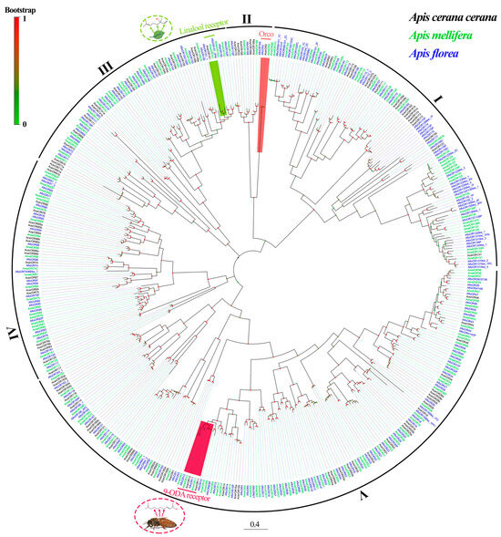 An ML phylogenetic tree of ORs was constructed using the datasets from A. cerana (106 ORs), A. mellifera (170 ORs), and A. florea (180 ORs). The AcerORs were named by reference to their homology genes from AmelORs. Consequently, all ORs were divided into five distinct clades: clade I contains 18 AcerORs and in this clade, most AmelORs and AfloORs contain nine exons. Clade II consists of 6 AcerORs: Orco clade belonging to this clade is highly conserved among different species, with more than 99% identity in the species examined in this study. Clade III and clade IV contain similar AcerOR numbers (18 and 20, respectively), while clade V contains the largest number of AcerORs (44) (Figure 3).