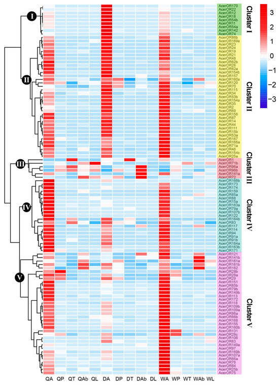 We found that more AcerORs were specifically expressed in the antenna and were more in queens and workers than in drones (Table 2). Among the AcerORs, some did not show significant expression differences among castes, such as AcerOR86b and AcerOR169a (cluster II). In contrast, some AcerORs exhibited caste-specific expression, such as AcerOR170 and AcerOR22 in drones (cluster I); AcerOR166b and AcerOR173 in queens (cluster IV); and AcerOR75 and AcerOR25b in workers (cluster V). Meanwhile, a few AcerORs were highly expressed in other non-olfactory tissues, for example, AcerOR96a, AcerOR96b, AcerOR141a, and AcerOR72 were highly expressed in the abdomen of drones, and AcerOR1 was highly expressed in the thorax of queens and drones (cluster III) (Figure 4).