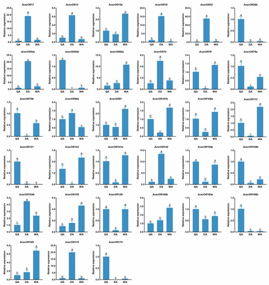 Figure 5. RT-qPCR results of 33 candidate AcerORs in the antennae of different castes in A. cerana. QA: Queen antenna; DA: Drone antenna; WA: Worker antenna. Different lower case letters indicates significant differences based on a one-way ANOVA followed by Tukey’s multiple comparison test (p < 0.05). Data indicate the mean ± standard error of the mean (SEM).