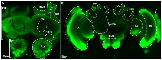 32. Groh, C.; Rossler, W. Caste-specific postembryonic development of primary and secondary olfactory centers in the female honeybee brain. Arthropod Struct. Dev. 2008, 37, 459–468. [Google Scholar] [CrossRef] [PubMed]