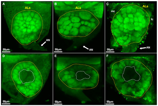 Figure 7. The appearance of A. cerana antennal lobes. (AC) ventral perspective; (DF) dorsal perspective; antennal lobes of (A,D) queen, (B,E) drone, and (C,F) worker. ALs: Antennal lobes; AN: Antennal nerve; mc: medial cluster of ALs neuron somata; lc: lateral cluster of antennal lobe neuron somata. The dashed yellow areas are ALs and dashed white areas indicate the absence of glomeruli.
