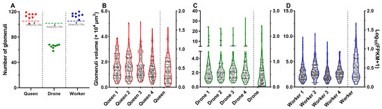 Previous studies reported that the location, volume, and shape of glomeruli significantly differ based on bee caste, which makes it difficult to identify homologous glomeruli [32]. Therefore, 3D models were reconstructed independently in different castes. The confocal image stacks were imported into 3D reconstruction software Amira v5.4.3, and the glomeruli were named based on their location (A, anterior; P, posterior; D, dorsal; V, ventral; L, lateral; M, medial; C, central). The volume and surface area of each glomerulus were estimated by “Label Analysis” in the software, and the types were classified based on glomeruli shape and location. The confocal images that were not clear enough for 3D reconstruction were used to calculate the number of glomeruli by Image J v1.8.0. In addition, the shape of glomeruli was defined by their volume and surface area [44].