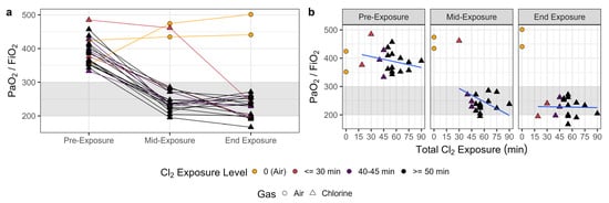 Chlorine inhalation exposure resulted in dose-dependent changes in PaO2/FiO2 (P/F) ratios. Swine were exposed to 240 ppm chlorine gas (Cl2, n = 19; triangles) or room air (n = 2; circles) via controlled ventilation for between 19 and 90 min. Arterial PaO2 was measured at baseline, midway through exposure, and immediately post-exposure, depending on their specific exposure duration. The P/F ratio was calculated assuming a 21% FiO2. Trends within individual animals (a) and correlation of P/F with exposure duration (b) are shown. Results are presented for air controls (in yellow), chlorine exposures of less than 30 min (in red), chlorine exposures between 40 and 45 min (in purple), and exposures 50 min and above (in black). The data in (b) are presented with linear fits (in blue) through the data points excluding air controls.
