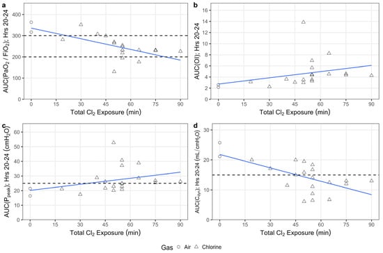 Chlorine inhalation exposure resulted in functional lung injury at 20–24 h post-exposure. Swine were exposed to 240 ppm chlorine gas (Cl2, n = 19) or room air (n = 2) via controlled ventilation for between 19 and 90 min. The PaO2/FiO2 (P/F) ratio (a), oxygenation index (OI) (b), peak airway pressure (Ppeak) (c) and dynamic compliance (Cdyn) (d) were recorded once hourly following the end of exposure, with the area under the curve (AUC) over the last 4 h (i.e., 20–24) represented above. Dashed lines represent the target thresholds for P/F between 200–300, for Ppeak of at least 25 cmH2O, and Cdyn of at most 15 mL/cmH2O. Results are presented with linear fits (in blue) through the data points, with air-exposed animals representing an exposure of 0.